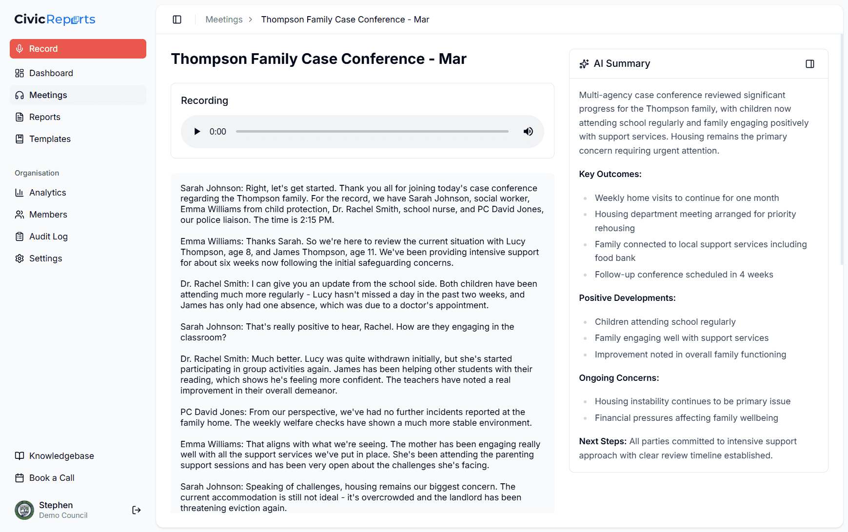 From meeting capture to professional reports - streamlined case documentation workflow designed for busy social care teams.